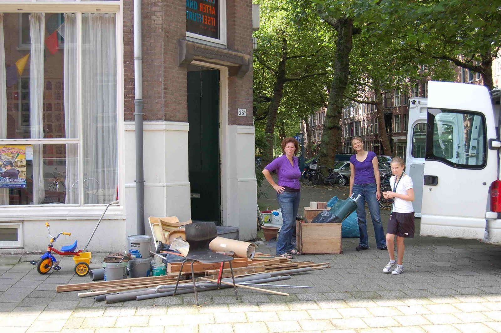 Groene verf, antieke kratten bier, kapotte kastjes en overtijdse Amsterdamse uitjes, het is kleine greep uit de opruiming van het hoekpandje. Zeker vier keer is er naar de stort gereden, met volle busladingen. De kelder is nu mooi leeg, een jongerenplek is al geclaimd, dus verzin wat leuks! Ook is er een prima voorstel voor de aankleding van de ramen. Wordt vervolgd!